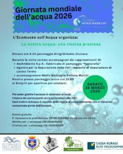 Per l’occasione l’Ecomuseo sull’Acqua ha organizzato per sabato 28 marzo un’uscita sul territorio per comprendere l’importanza della nostra acqua per garantire i servizi essenziali. Accompagnati come sempre da esperti del settore, visiteremo il depuratore e uno dei bacini di pompaggio siti nel nostro Comune, osservando anche come questi di integrano nell’ambiente circostante.