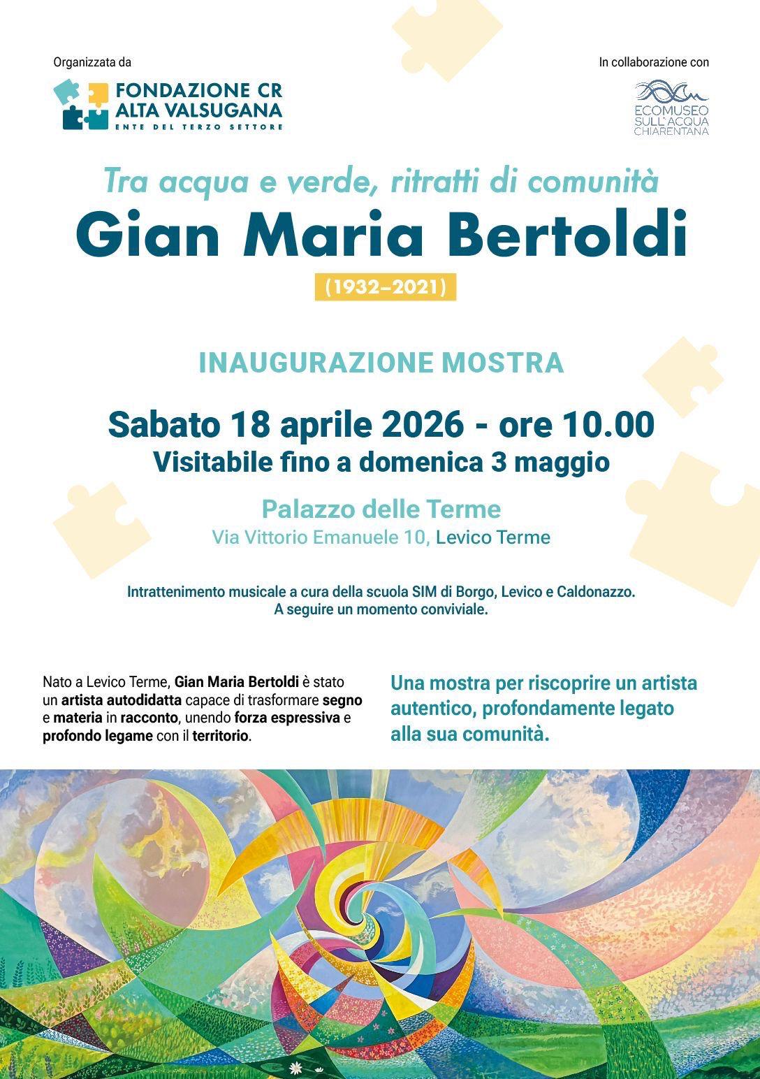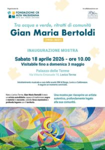 Sabato 18 aprile 2026 alle ore 10:00, presso il Palazzo delle Terme, verrà inaugurata la mostra “Tra acqua e verde, ritratti di comunità Gian Maria Bertoldi“, organizzata dalla Fondazione Cassa Rurale Alta Valsugana.